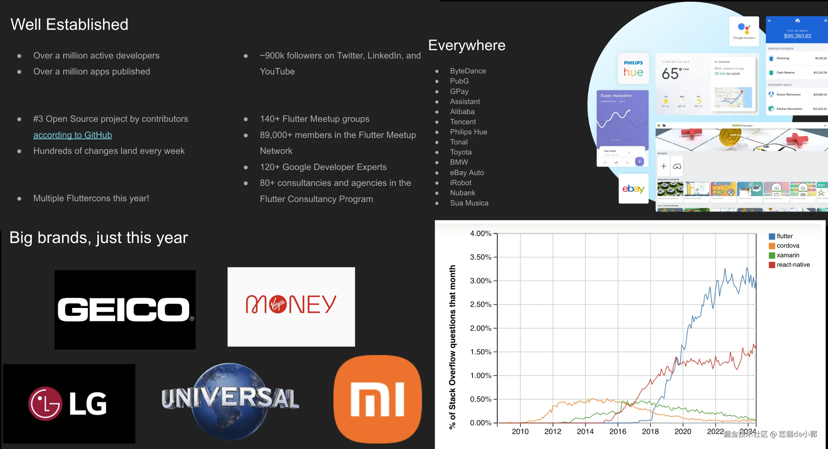而十年后的今天,在 2024 年,Flutter 已经取得了不错的成就和地位,虽然问题依然还有,但是在各个方便都已经开始走向成熟,不管是谷歌内部的 App,还是全球各大企业的产品,都可以看到 Flutter 得身影。