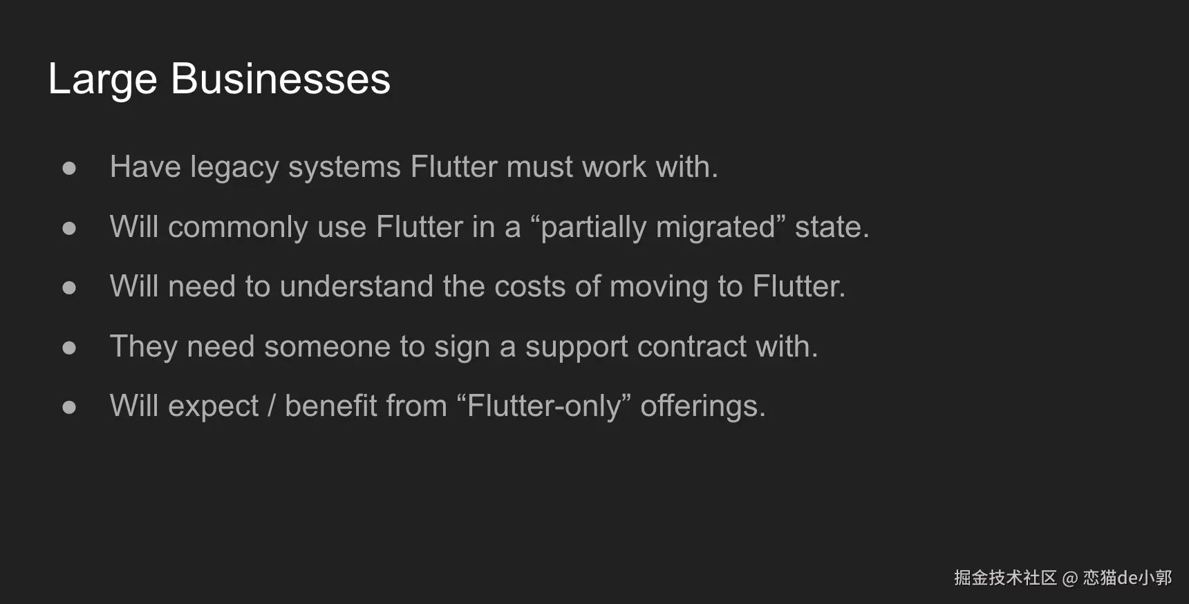 而在商业化领域,Flutter 目前也探索和合作出不少机会,可以看到覆盖了涉及各个领域基于 Dart 和 Flutter 的技术产品,不过这里 Eirc 分享了一个观点,来自董天成大佬的转述: