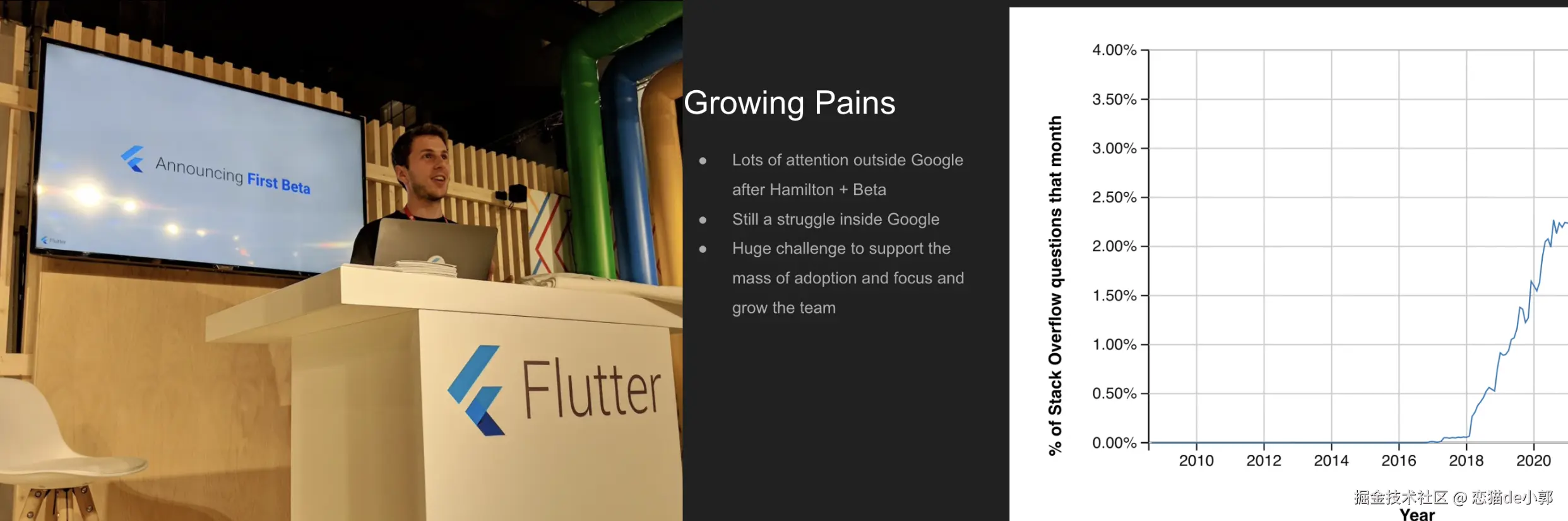 自此 Flutter 引来了快速发展的时期,越来越多的平台和项目接入 Flutter ,Flutter 也开始支持更多的平台,而在当时,Flutter 对于大多数商业项目来说,还是一个冒险的尝试: