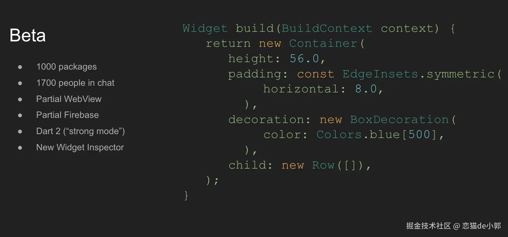 在此之后 Flutter 开启了商业合作,在商业项目取得阶段性成果之后,Flutter 发布了第一个 Beta 版本,而此时的 Flutter 生态已经「初具规模」。