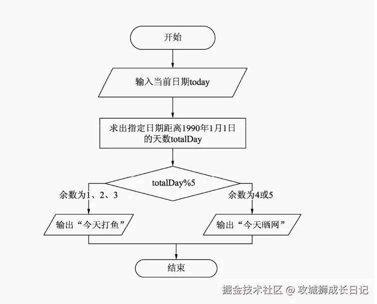 - 由于“打鱼”和“晒网”的周期为5天,所以将计算出的天数用5去除。