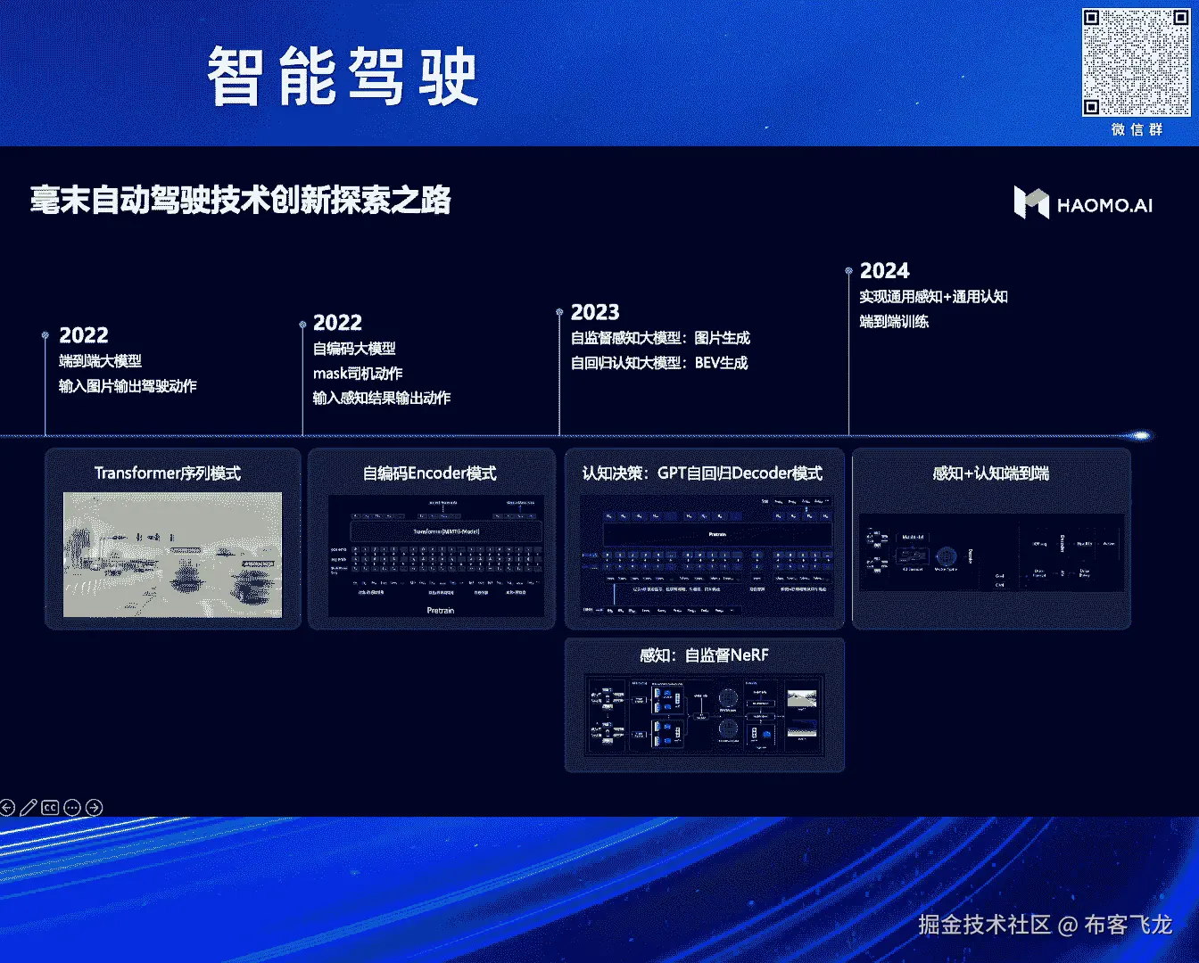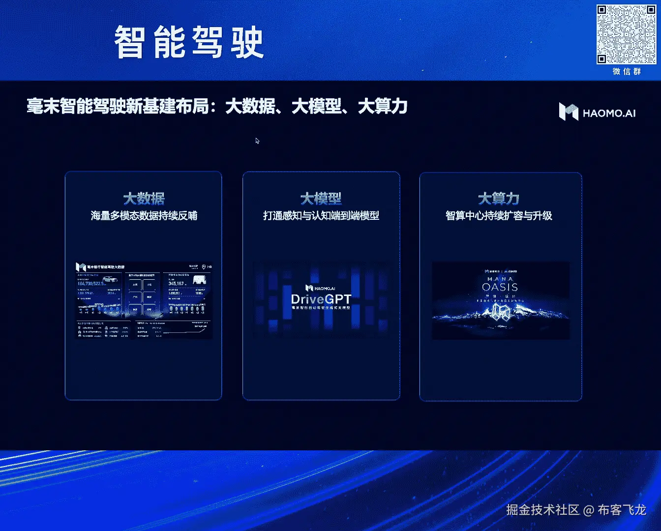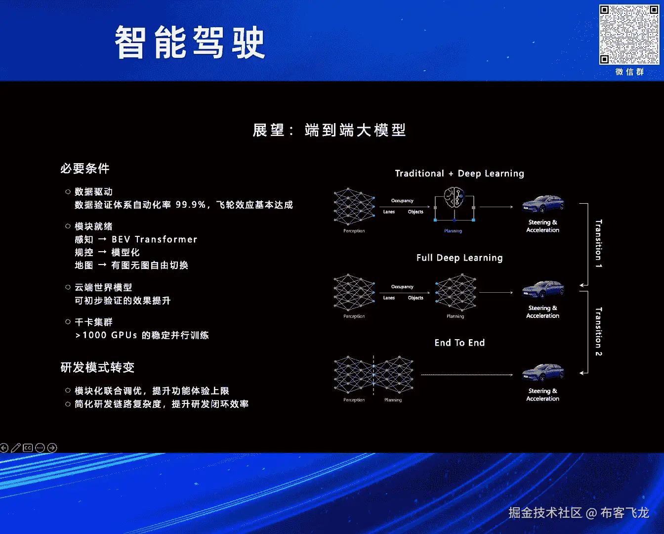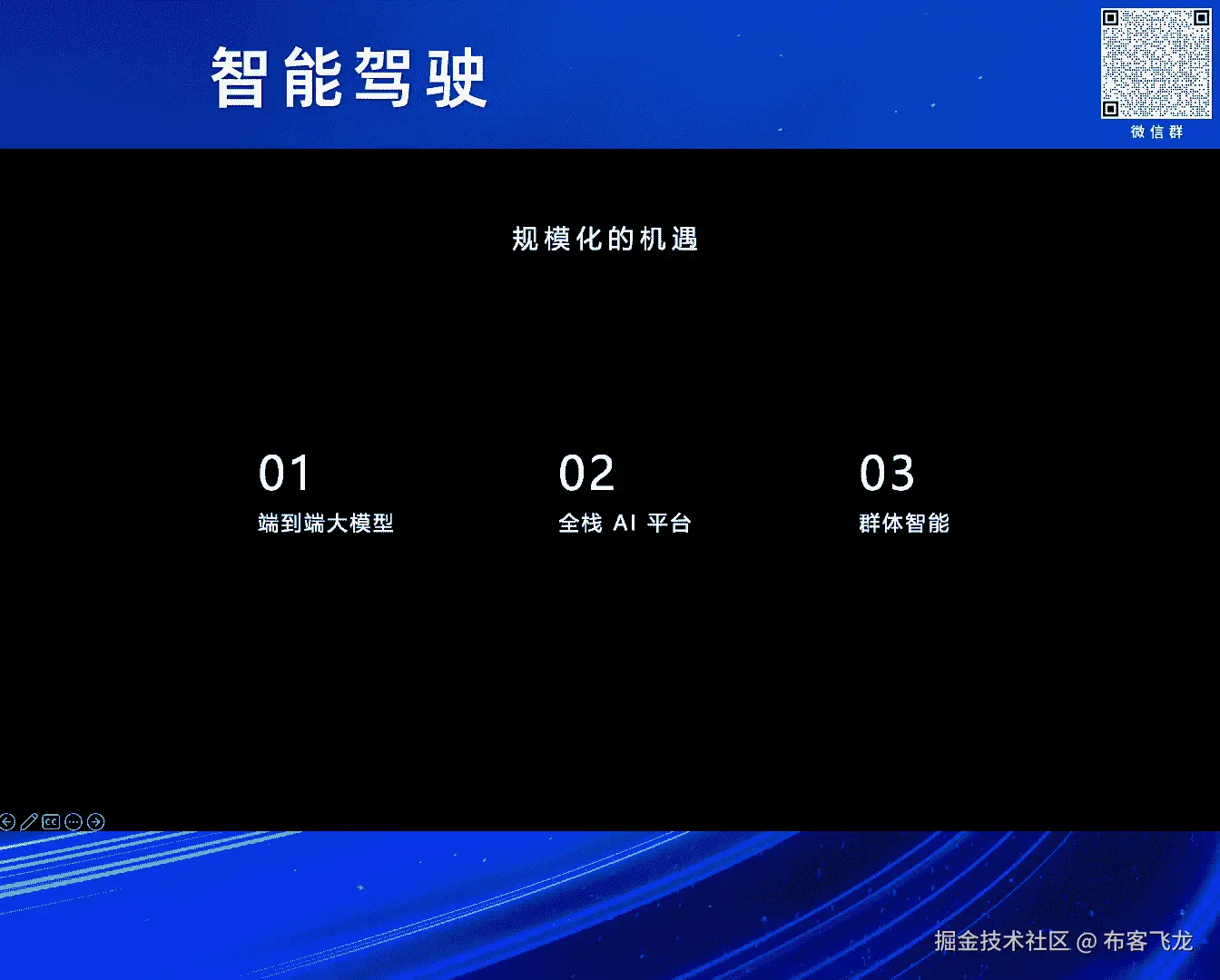 我们也可以展望未来,那用在脚踏实地的同时,我们也仰望星空,自动驾驶的发展也充满了无限的可能,接下来呢我愿意分享几个关键方向的一些看法,包括端到端的大模型,全站的AI平台以及群体智能技术。