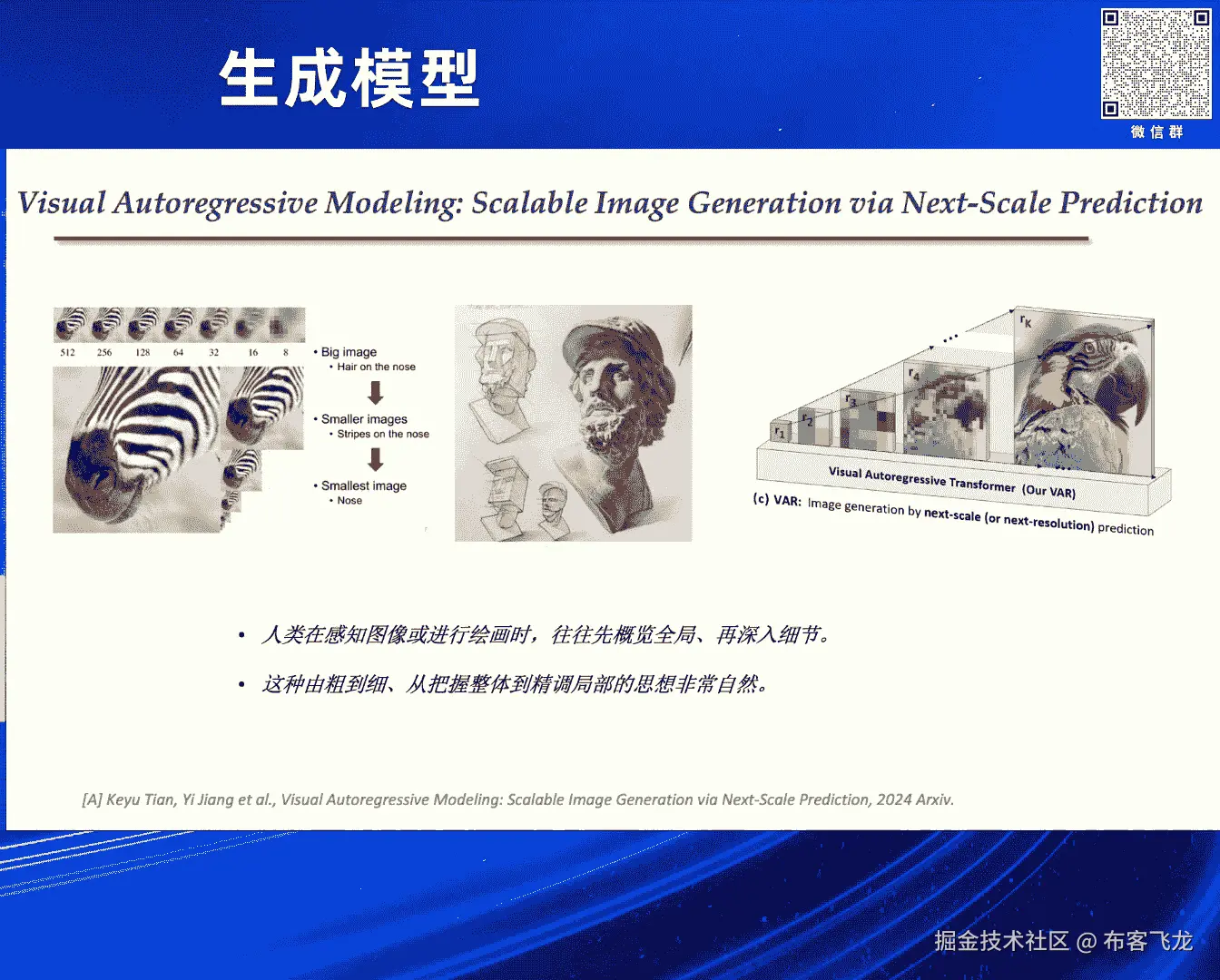 然后我我总结一下,就是说我们使用了一个多尺度自回归的范式,和基于这个next scale prediction的这样呃,构建了一个全新的生成框架,为视觉的自回归算法提供了一种新的思路。