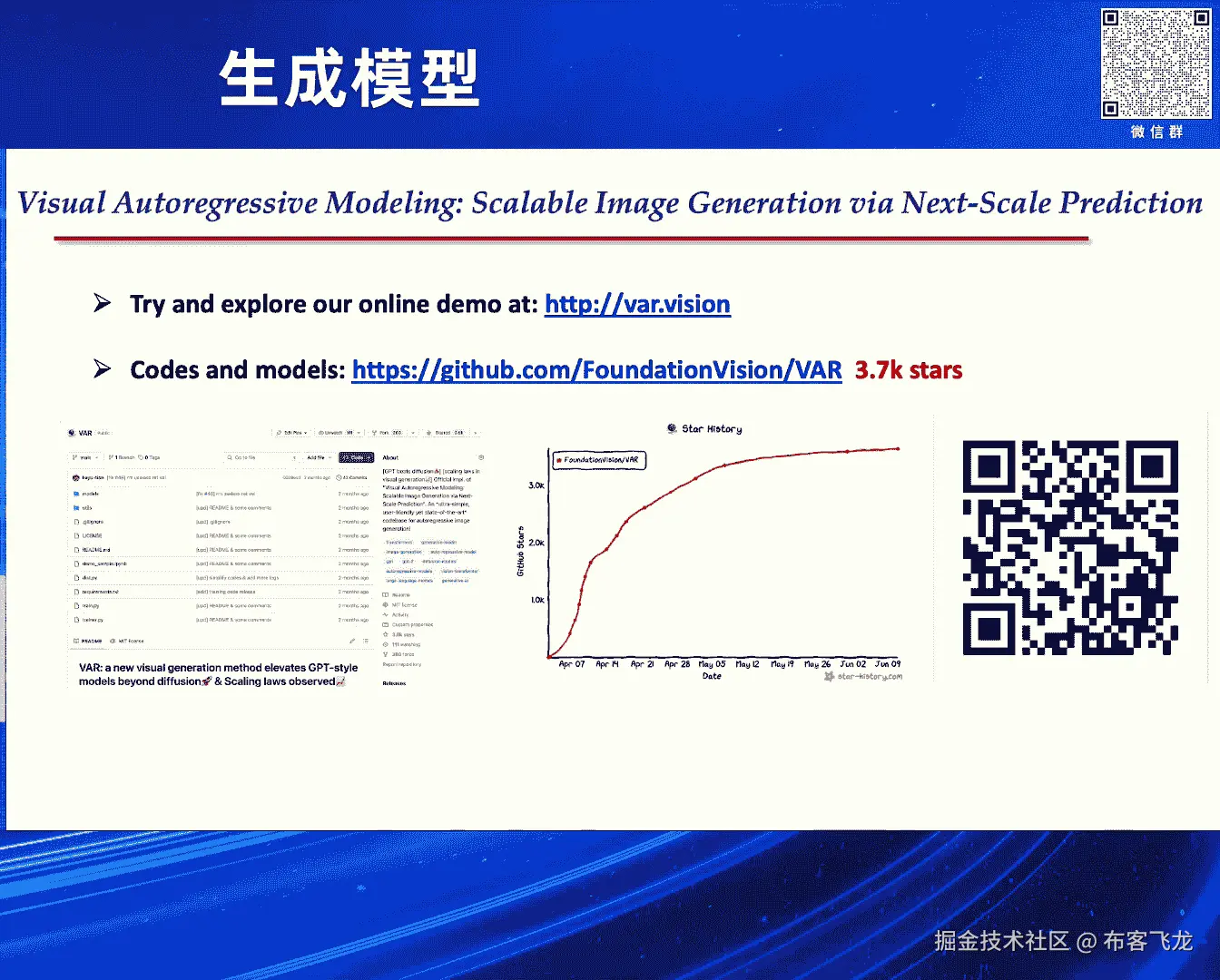 是我们视觉自回归模型的一个性能突破啊,使用这种典型的GBT风格的次回归的呃,呃就是方法在图像呃生成中,首次超过了这种强大的这种debution model,包括DIT,最后就是因为呃就我们开源了。