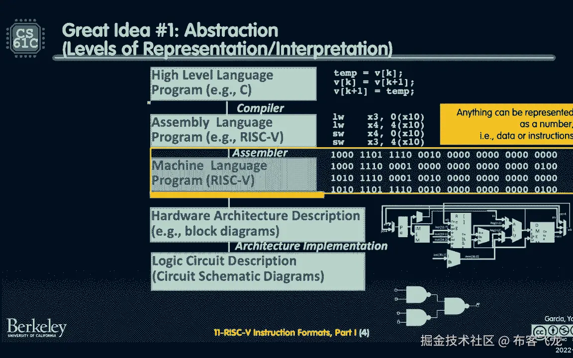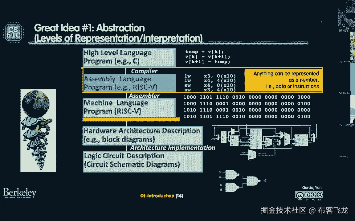 事实证明,这种抽象的想法也发生在硬件中,我们将在头五周使用的最大的抽象之一,所有东西都可以是一个数字位,零和一,这是我们将再次讨论的问题,再一次,是啊,是啊,一路下来都是乌龟,所以数字一直在下降。