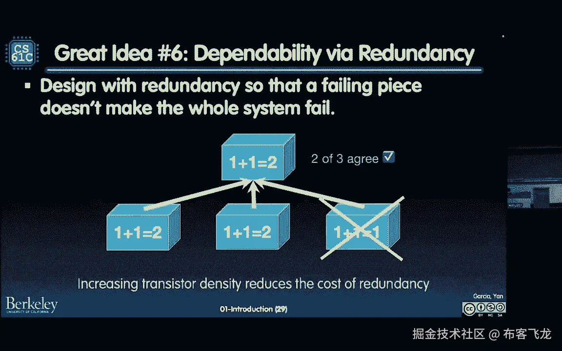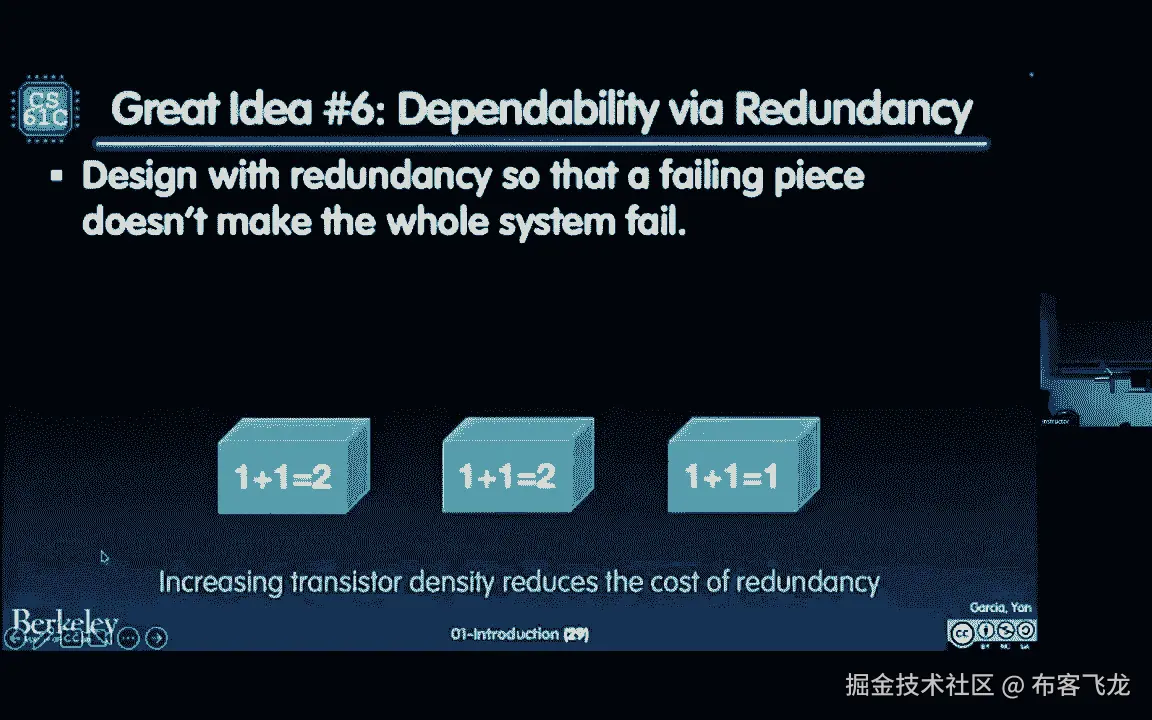 一个人流氓,然后说一加一等于一,你占了多数,你说,好啦,我只接受大多数人的回答,这种冗余的想法又是什么,我们将一遍又一遍地看到,增加晶体管密度降低冗余成本。
