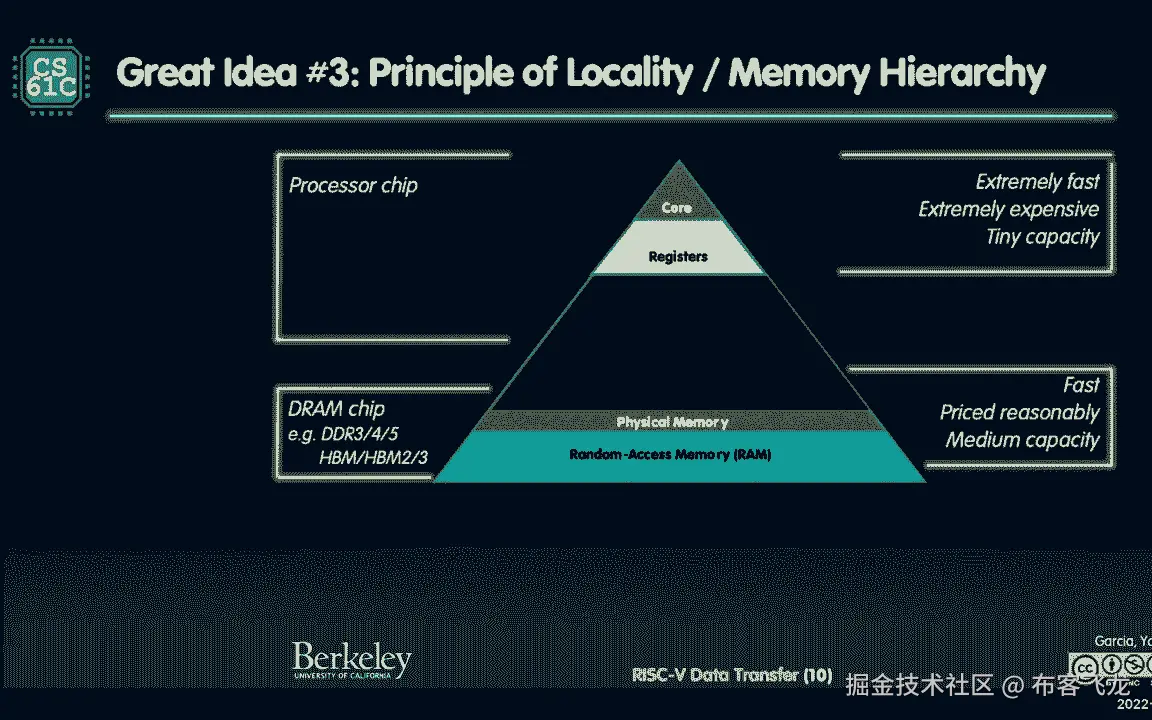 这是同一张图,只是有点翻转,所以你看,注册在这里的最上面,就在CPU核心之后,这意味着什么,这个金字塔说的是当你沿着金字塔往下走,事情的变化是一个数量级的,所以在最上面,这是极快的,极其昂贵。