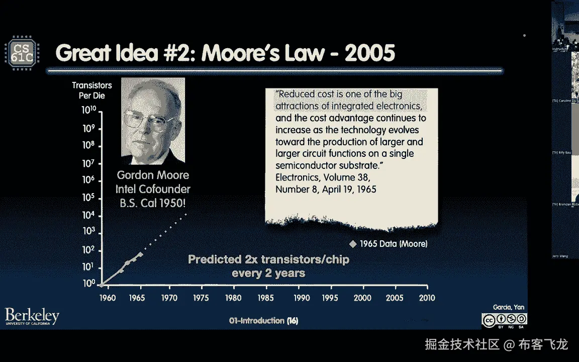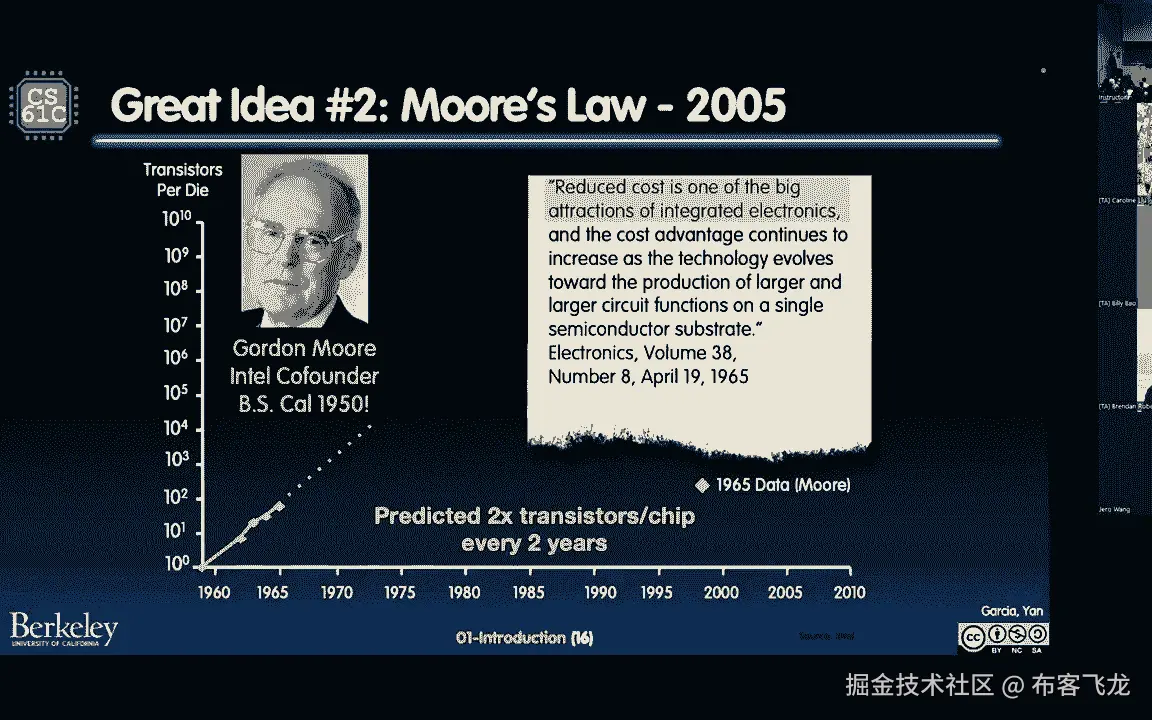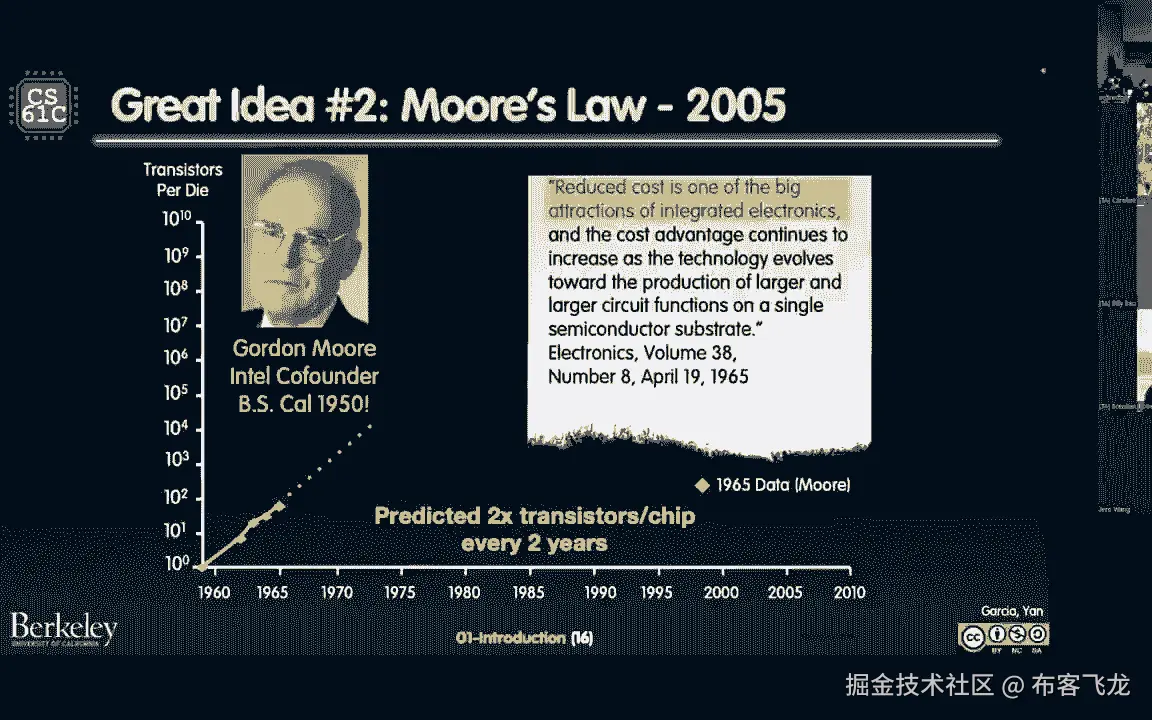 我们将有的第二大想法,这个伟大的想法叫做摩尔定律,所以戈登·摩尔实际上是奶牛的校友,去吧,在1965年就预测到了大海,十七十年左右,在最初的几个计算机芯片被创造出来之后,并说嘿,这个叫晶体管的东西。