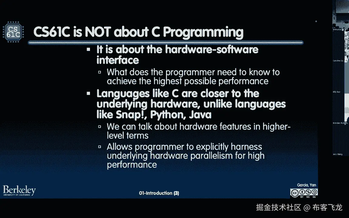 免得你以为我们把这门课叫做,教你关于c语言的知识,那是不正确的,一切都是关于奇妙的硬件,软件接口,计算机是如何工作的,但不仅仅是一台电脑,数据中心的实际工作方式,我们不谈论语言,像C更接近低层硬件。