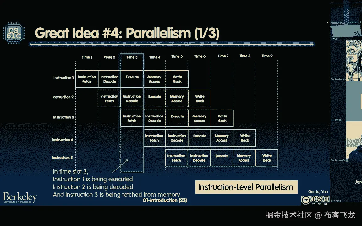 这些就像你CPU里的时间周期,时隙,三件事同时发生,有三种不同的指令,一个人在执行指令,另一个人在解码指令和指令,三个开始看到他们有什么指令正在从记忆中提取,这是指令级并行。