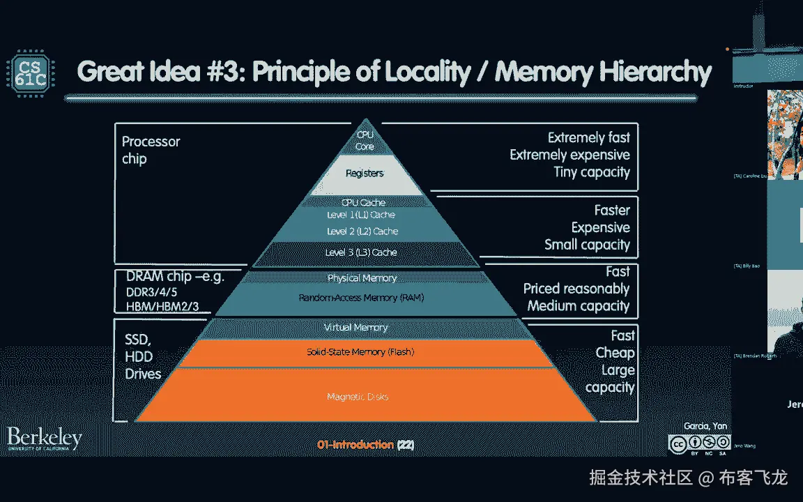 当你一层一层往下走时,微小的容量,嗯,东西变得便宜了一个数量级,而东西变得更大了一个数量级,但也会慢一个数量级,所以我们会一次又一次地看到这个原理,局部性原理,你如何访问金字塔下的东西。