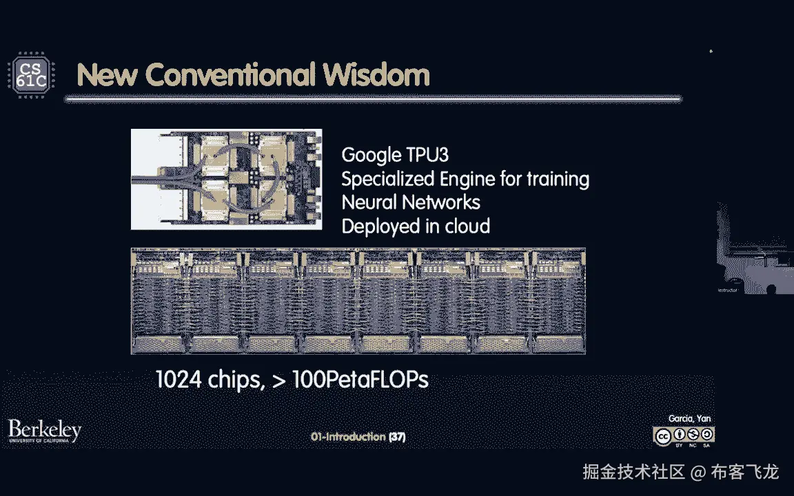 但是要设计特定领域的体系结构,下面是谷歌的张量处理单元或TPU的一个例子,其实呢,这是谷歌的TPU三号,这是发布的,我想两年前,这是一个专门训练神经网络的引擎,如果你仔细看,这里有四个不同的单元。