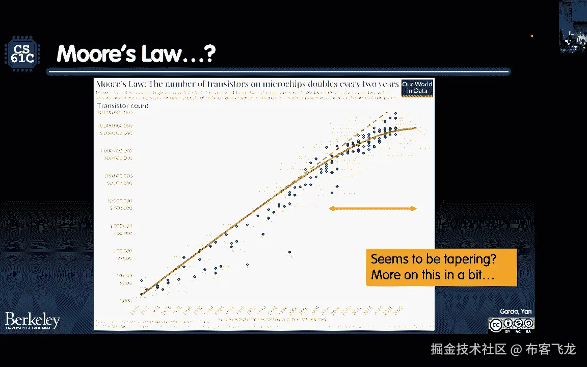 所以原因是这样的,第一名,为什么计算机体系结构令人兴奋,首先摩尔定律有些极限,我的意思是,这是晶体管的数量--它还在增长,所以我把图延伸到这里,所以你看图表是到20点10分左右,我把图表延伸到过去十年。