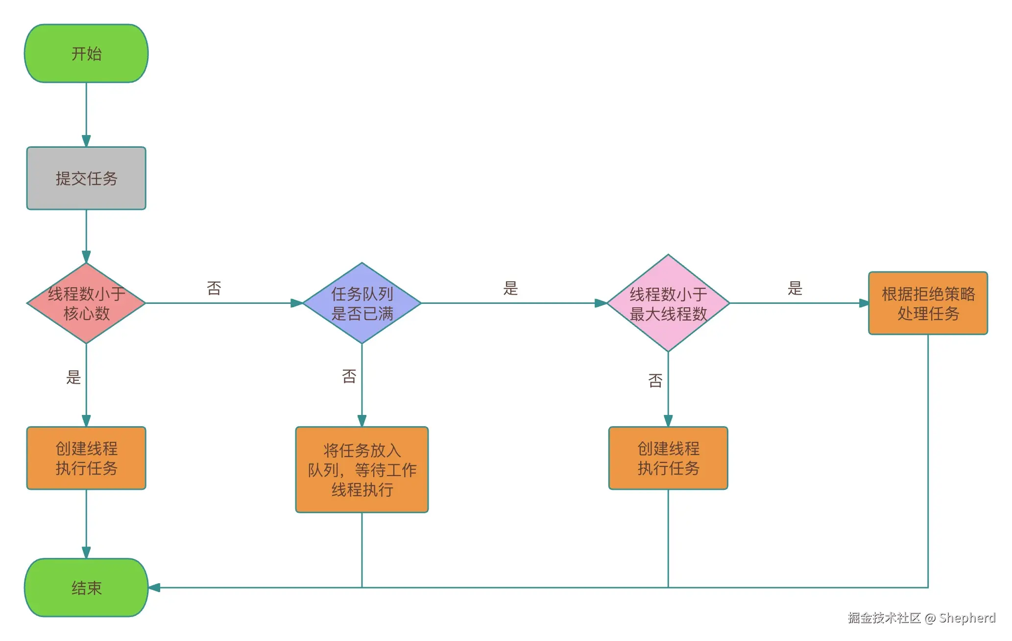 - 线程池判断任务队列是否已经满。如果任务队列没有满,则将新提交的任务放入这个任务队列中,等待工作线程执行。如果满了,则进入下个流程。