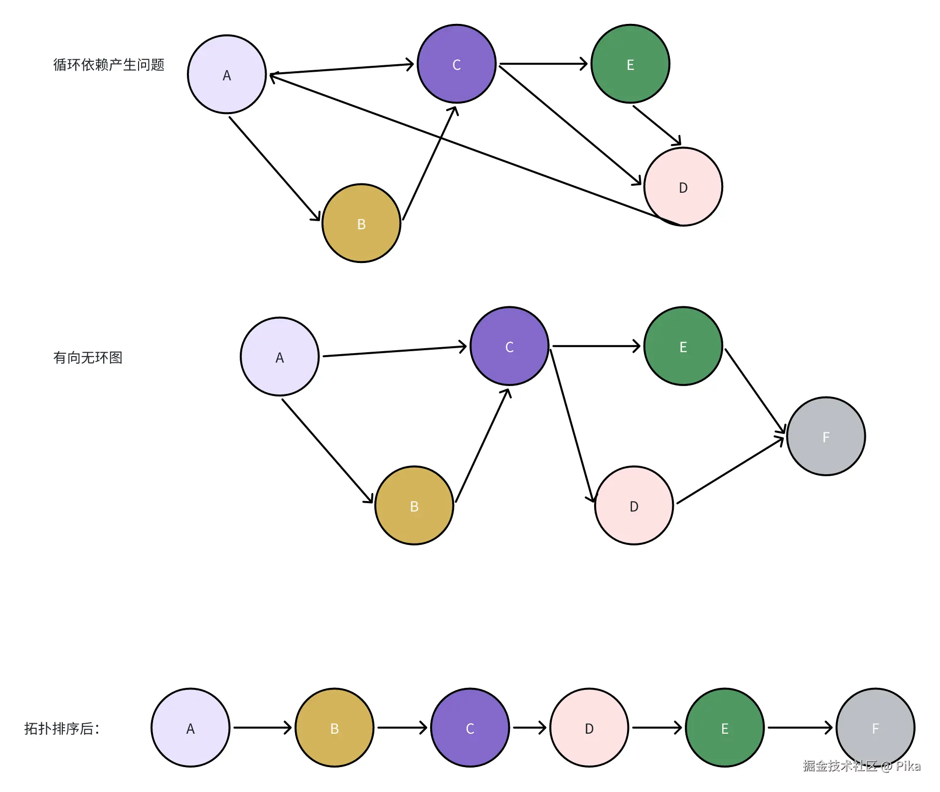 - 如果结果列表中的节点数量与图中节点数量相同,则说明所有节点都被处理,拓扑排序成功。如果不相同,说明图中存在环,拓扑排序失败。