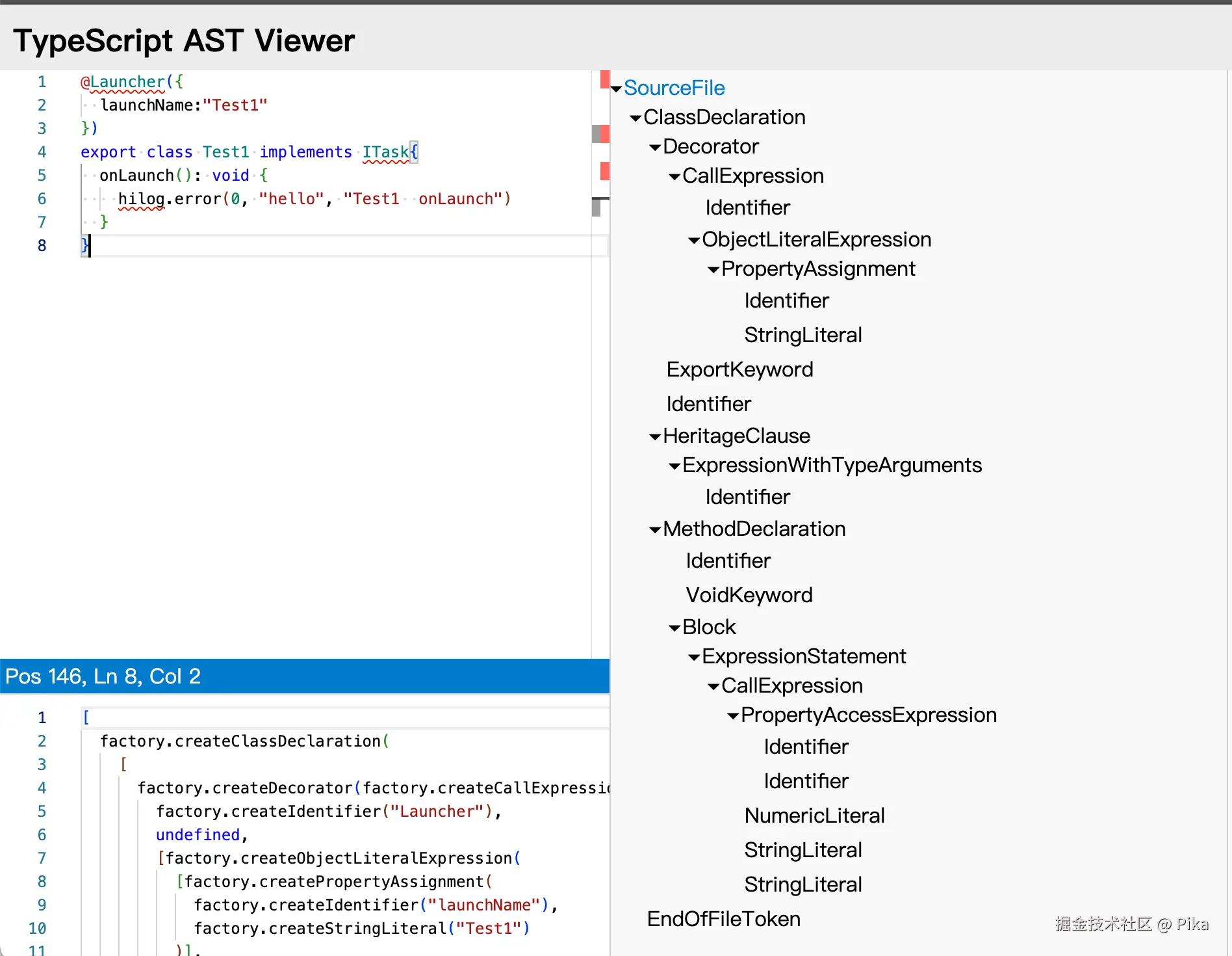 关于抽象语法树的知识,可以前往TypeScript项目中查看,因为整个TypeScript是开源的,我们这里不多展开,简单来说就是源码会经过编译生成一系列更近底层的表达式,这些表达式会有独立的一个个节点组成,我们可以通过TypeScript AST Viewer查看对应的产物