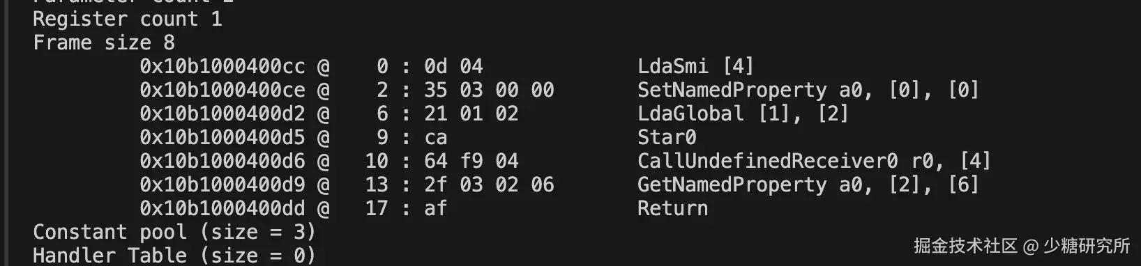 - Ldar a1,(LoaD Accumulator from Register)这是将 a1 寄存器中的参数值加载到累加器中,这时候第二个参数就保存到累加器中了。