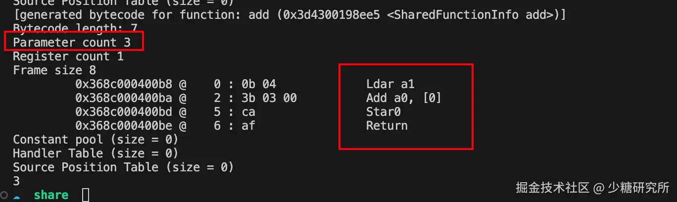 - 接下来执行加法操作,Add a0, [0],因为 a0 是第一个寄存器,存放了第一个参数,Add a0 就是将第一个寄存器中的值和累加器中的值相加,也就是将累加器中的 2 和通用寄存器中 a0 中的 1 进行相加,同时将相加后的结果 3 保存到累加器中。