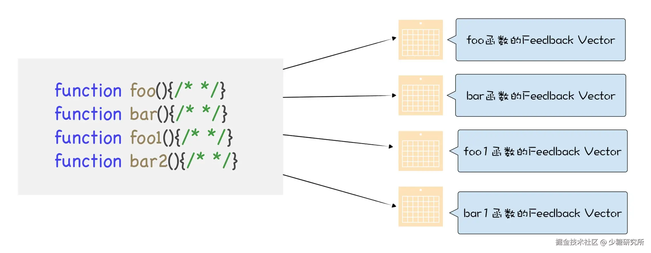 IC 会为每个函数维护一个反馈向量 (FeedBack Vector) ,反馈向量记录了函数在执行过程中的一些关键的中间数据。关于函数和反馈向量的关系你可以参看下图: