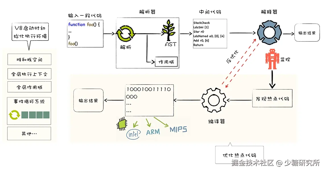 - 代码架构清晰:采用字节码,可以简化程序的复杂度,使得 V8 移植到不同的 CPU 架构平台更加容易。(字节码是平台无关的,机器码针对不同的平台都是不一样的)