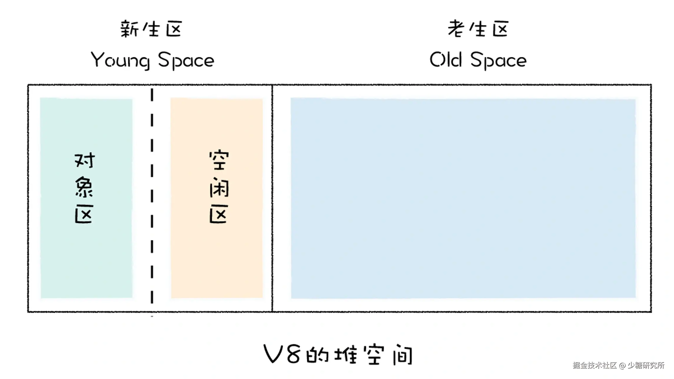 在 V8 中,会把堆分为新生代和老生代两个区域,新生代中存放的是生存时间短的对象,老生代中存放生存时间久的对象: