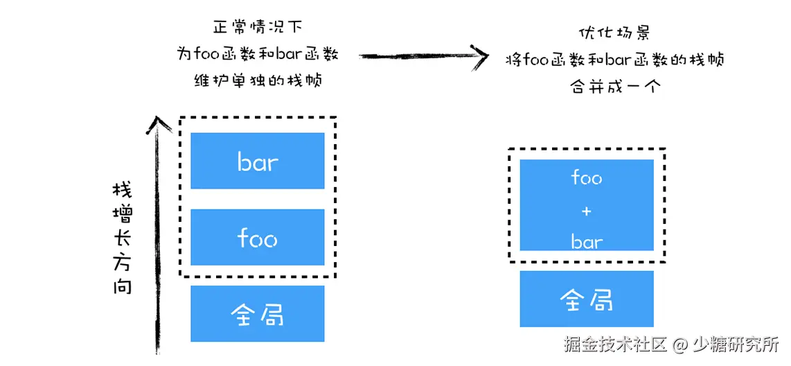 通常情况下,这没有问题,但是在 foo 函数中,采用了大量的循环来重复调用 bar 函数,这就意味着 V8 需要不断为 bar 函数创建栈帧,销毁栈帧,那么这样势必会影响到 foo 函数的执行效率。