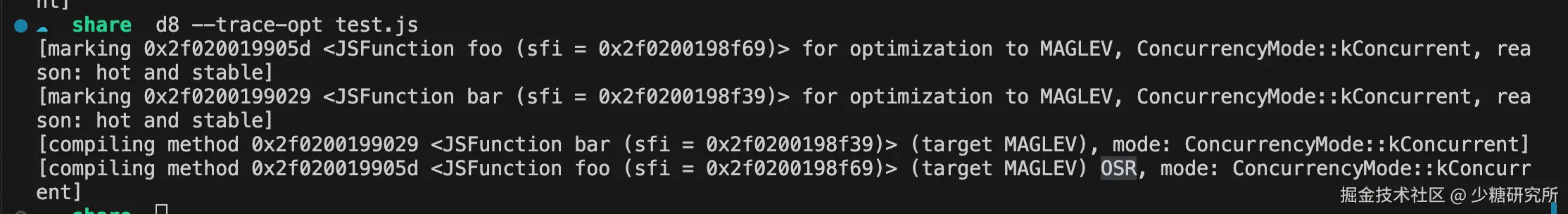 我们也可以通过 d8 查看生成的字节码和机器码。通过下面两行代码我们将js代码的机器码和字节码输入到 code 和 bytecode 文件中。