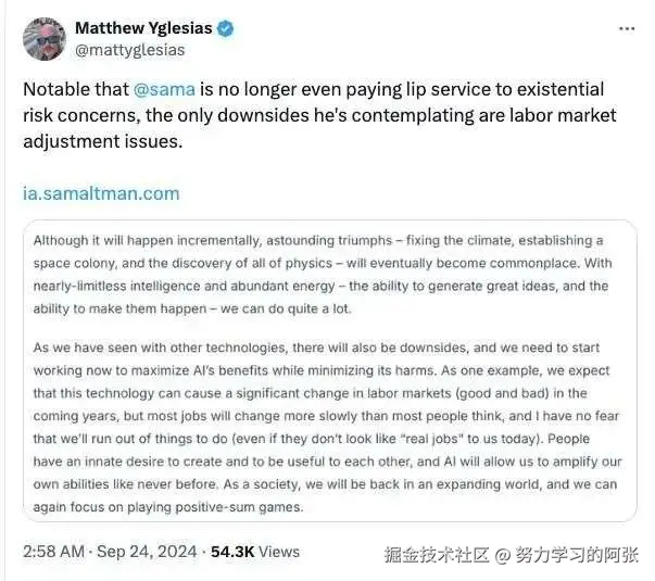 即使像 SB-1047 这样的 AI 监管条例已经成为当下的热门话题,奥特曼也没有在文中特别提及 AI 技术带来的科幻性质的风险。在 X 上,彭博专栏作家 Matthew Yglesias 写道,“值得注意的是,奥特曼甚至不再口头讨论生存风险的问题,他唯一担忧的 AI 弊端就是对劳动力市场造成的冲击。”
