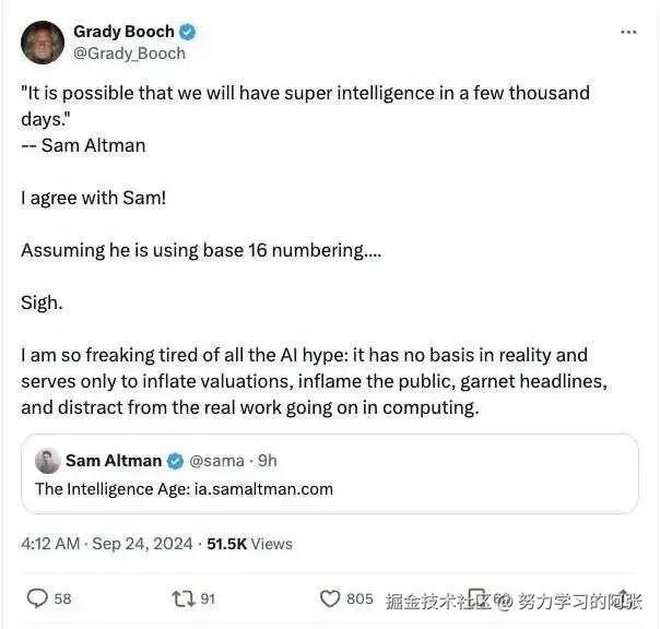 而且并非所有人都认同奥特曼表现出的乐观和热情。计算机科学家、时常批评 AI 技术的 Grady Booch 引用了奥特曼“几千天”的预测,在 X 上发帖评论称:“我对一切 AI 炒作感到极度厌倦:它们没有任何现实依据,只会抬高期待、激怒公众、登上媒体头条,并分散人们对于计算领域实际工作的注意力。”