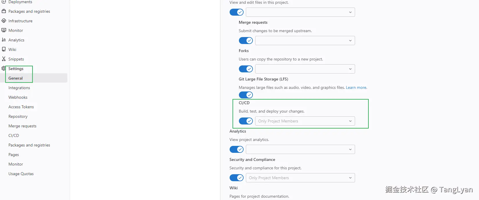 当打开gitlab对应的项目后,也许存在左边导航栏中没有CI/CD小火箭的标识。那么点击Settings->General->Visibility, project features, permissions 右边的Expand->Repository->CI/CD 勾选上。