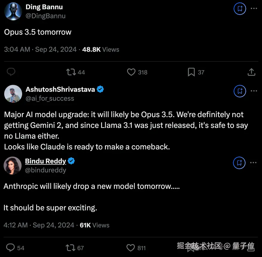 Logan 本人下场,对 Gemini 上新的猜测自不必说,不过在这一话题下,也有不少爆料博主纷纷跟进给出另一个关键词:Claude 3.5 Opus。