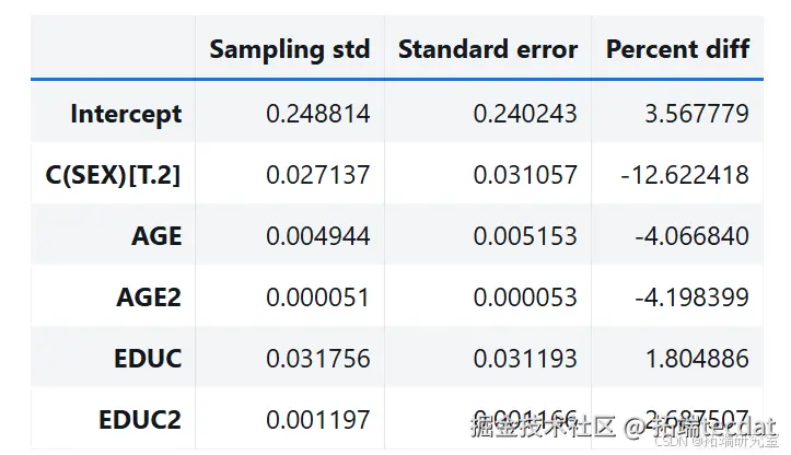 得到抽样分布样本,分析参数的抽样分布,标准误差与 StatsModels 计算的误差相当。