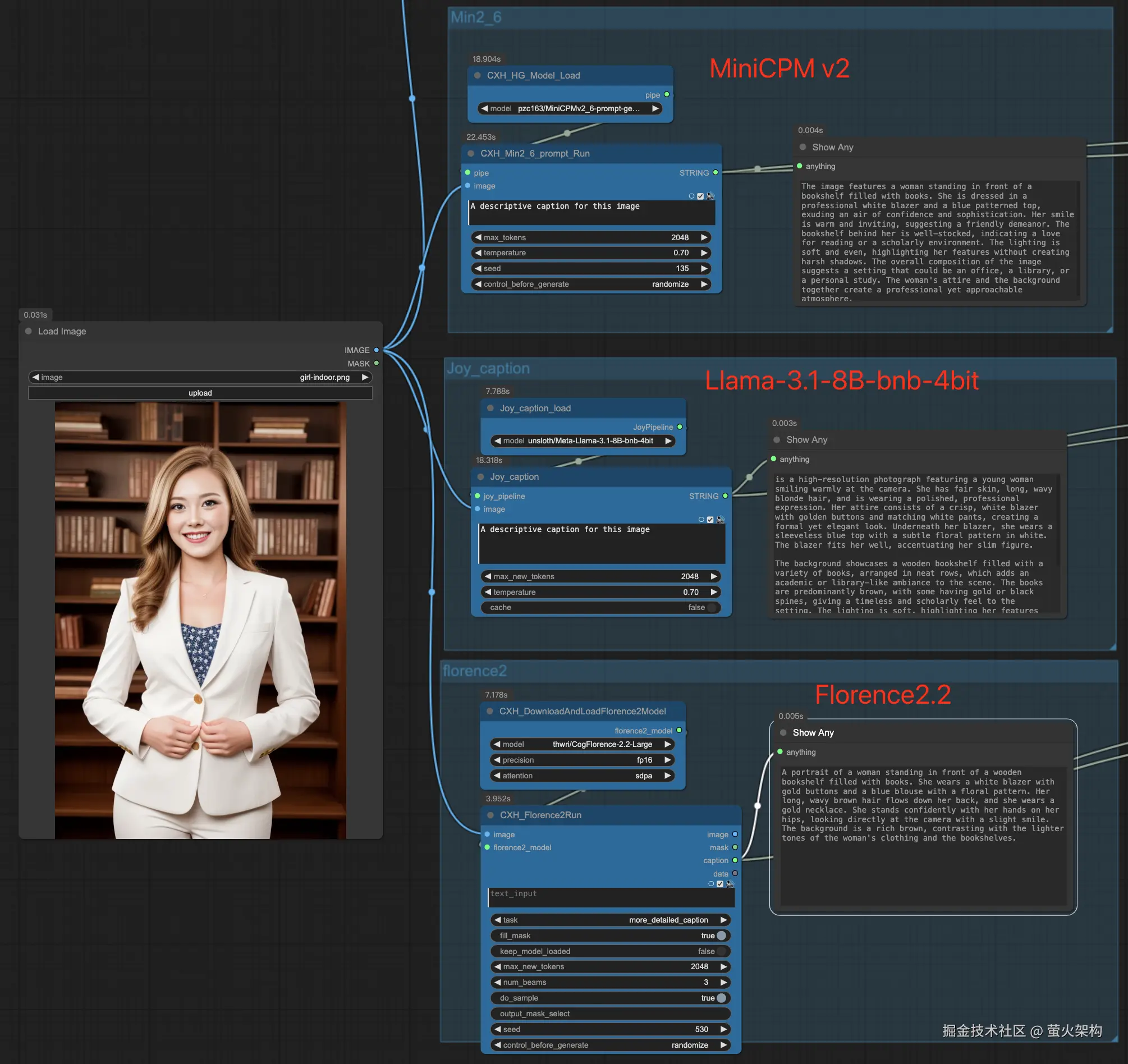 JoyCaption 内部提供了多个提示词反推方法,下图对比了使用 Min2_6、Joy_caption、Florence2反推提示词的效果。