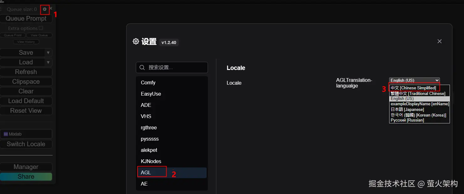 ComfyUI在浏览器中启动后,我们可以先通过设置切换到中文界面,选择“中文”: