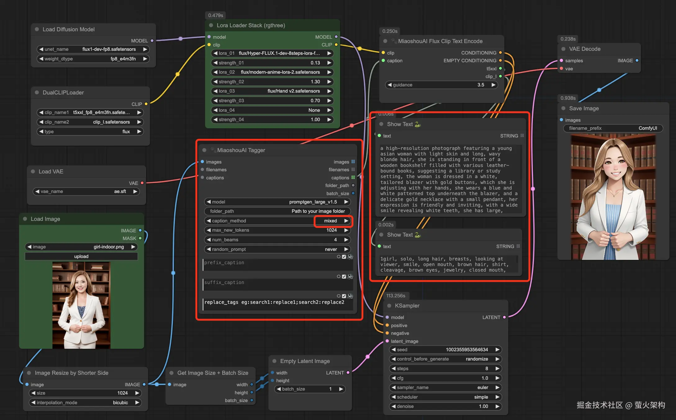 这个插件也会使用上文提到的 Florence2 模型,使用的是 Florence-2-large-PromptGen-v1.5,,然后它可以同时输出两种格式提示词(caption_method选择mixed),搭配Flux,生成效果比较完美。演示效果如下图所示: