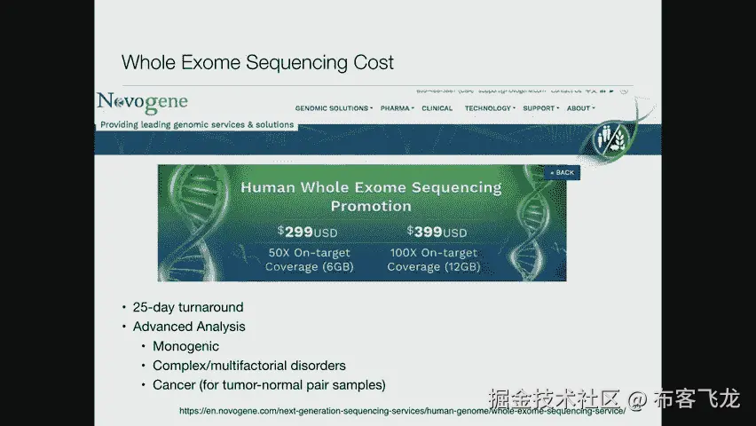 事实上,如果你只是对整个Exome感兴趣,所以只有大约2%的基因,产生遗传编码的DNA,你现在可以去这家公司,与我无关,我刚从网上找到这个,但你知道只要299美元,他们会给你50倍的覆盖大约6G。