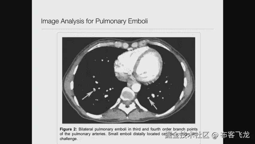 正如我所说的,我今天不打算讨论这个问题,但这是最近发表的一篇非常成功的论文,在那里他们可以看到肺部的图像,这是肺部的横向扫描,他们有一个深度学习机器能够识别这两个黄色标记的东西,肺包膜。