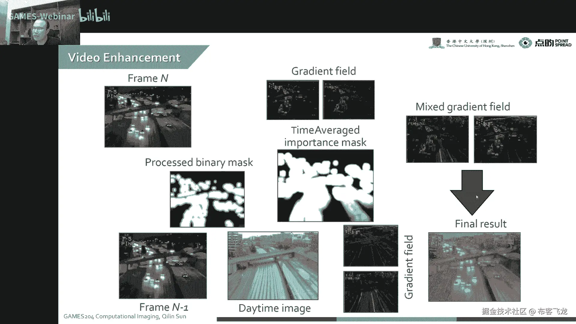 然后在这个通过这个gradient integration的方法,把这个融合起来,就可以实现诶,我们在夜间监控的时候啊,只有一张参考,白天参考图像的时候,也可对夜间的video进行一个很好的一个增强。
