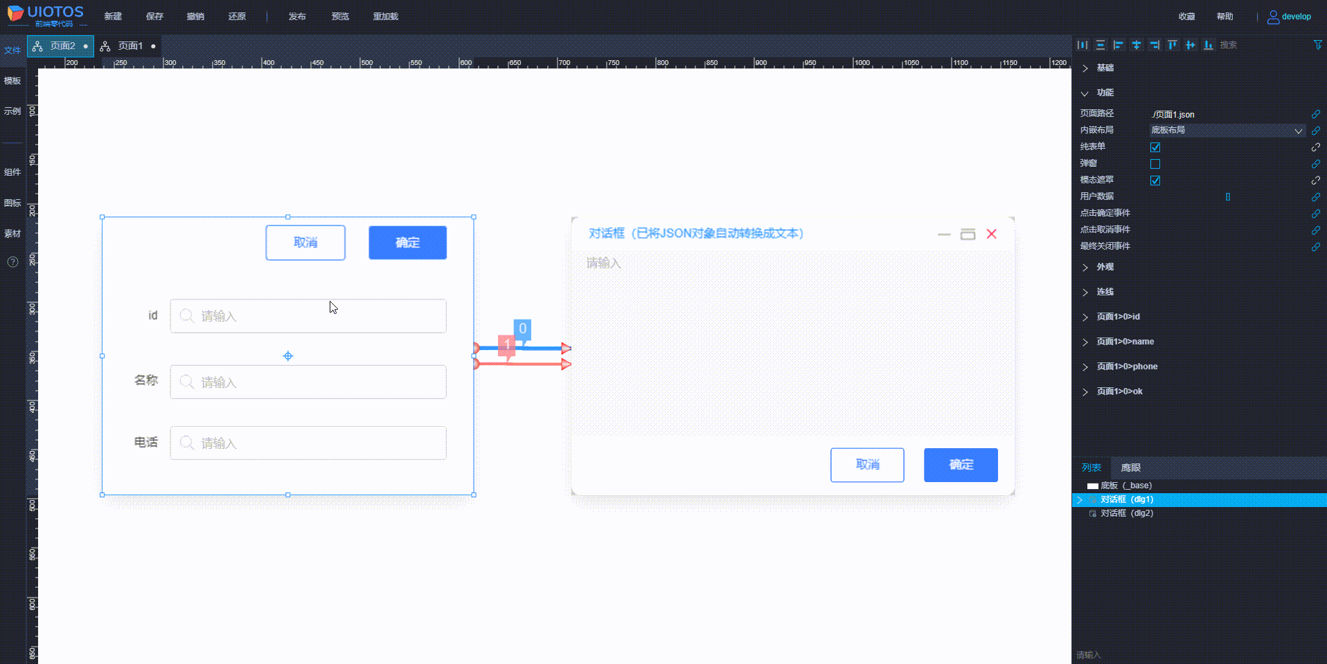 连线关联内嵌确定按钮的点击事件,操作对话框的值内容和弹窗。当然,操作值内容的关联属性可以为空。
