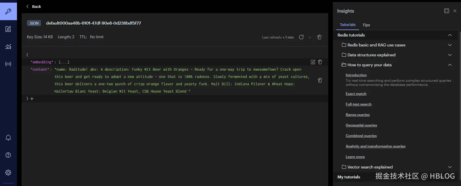 - 在检索时,查询文本被向量化,然后与 Redis 中存储的向量进行相似度比较,找到相似度最高的向量(即相关的文档)。