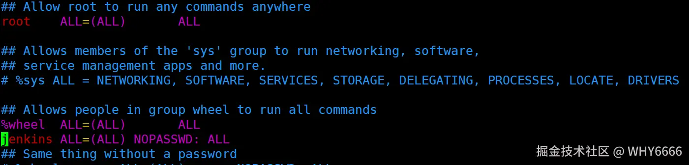此时为了使得jenkins用户能够使用sudo指令,在/etc/sudoers文件中赋予相关权限: