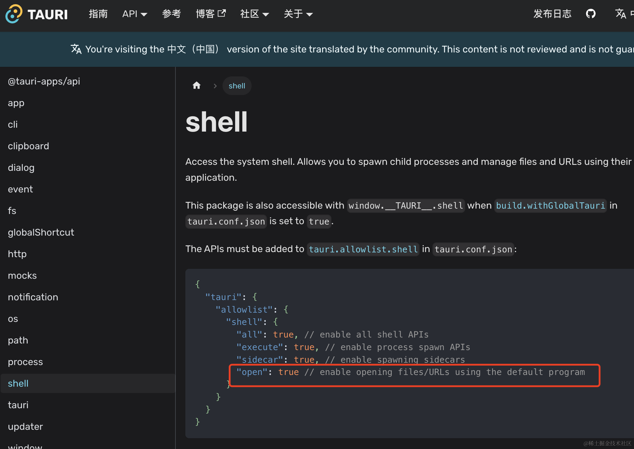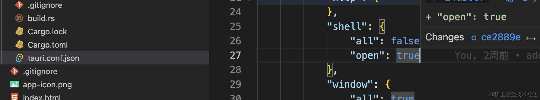 就是使用这个api来打开指定的url链接,要在tauri.config.json中配置打开这个api: