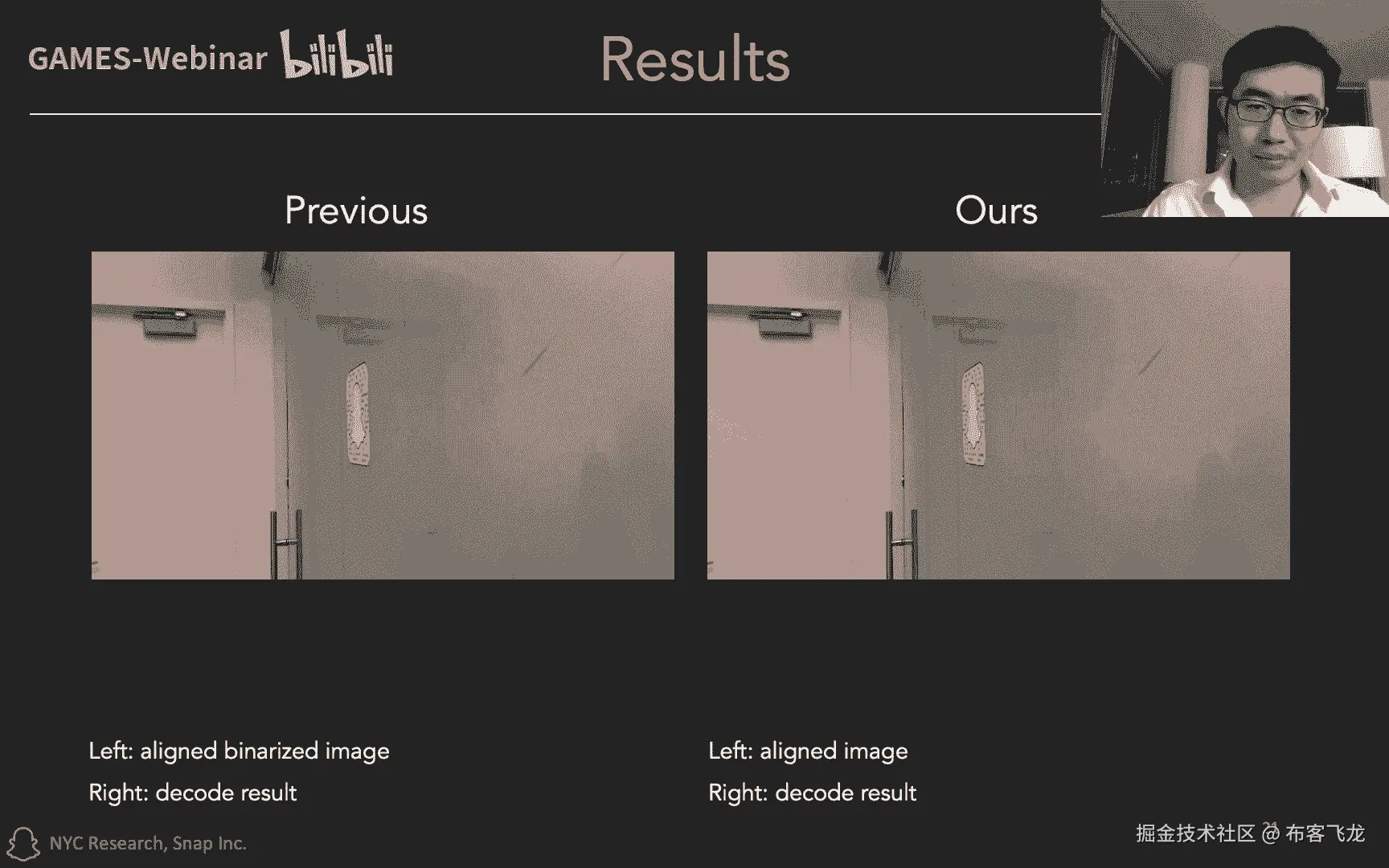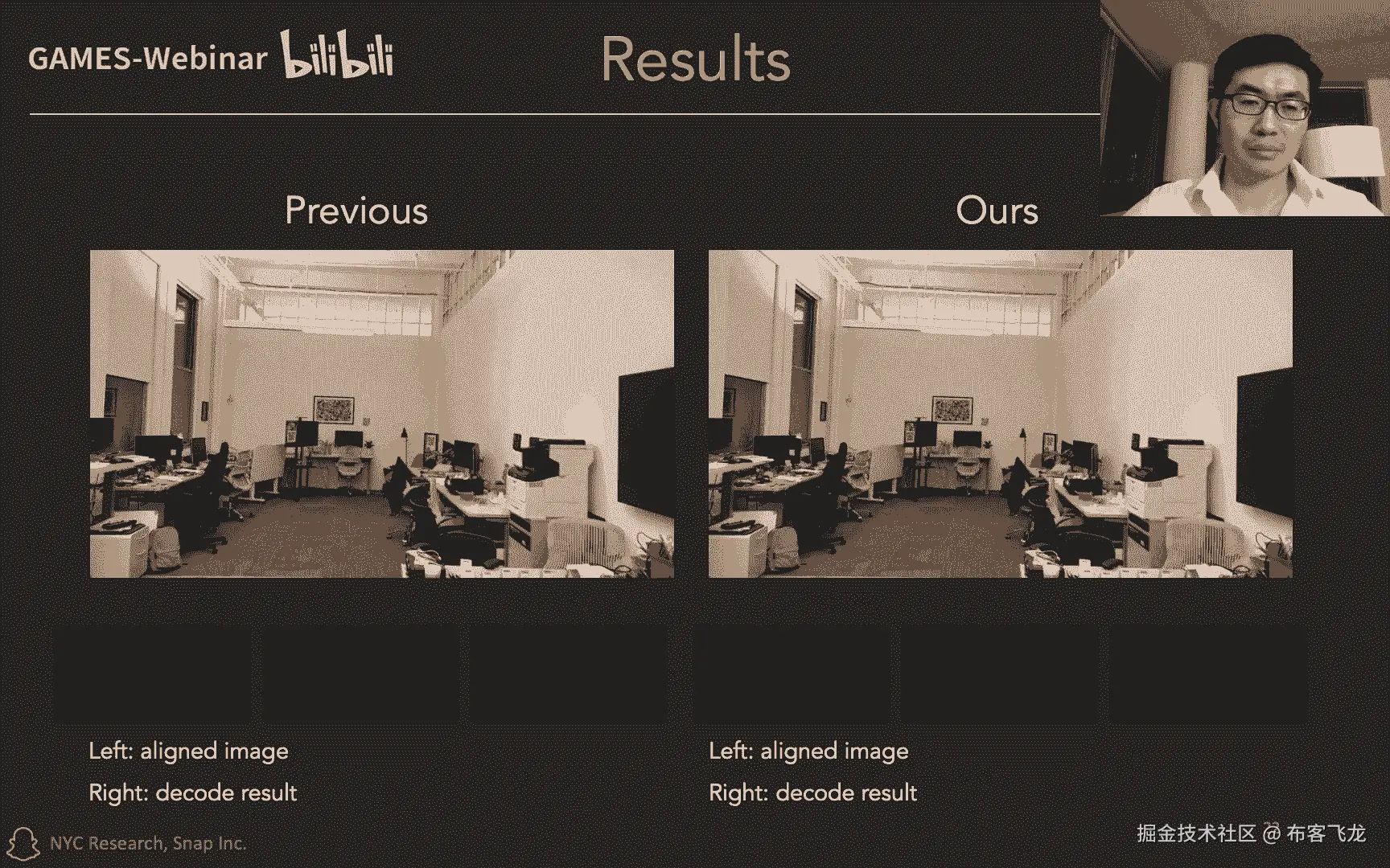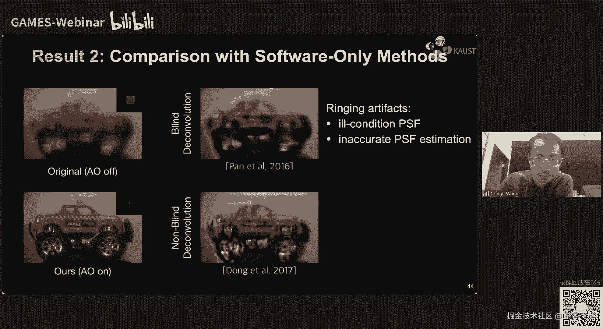 而是很多图像的叠加就会产生了不,我们就希望说诶我们是否能用算法计算全息的方法,通过预计算在photogram上做视频coding,那通过这个公式的decoding,把这个blog给尽可能弱化,消除影响。