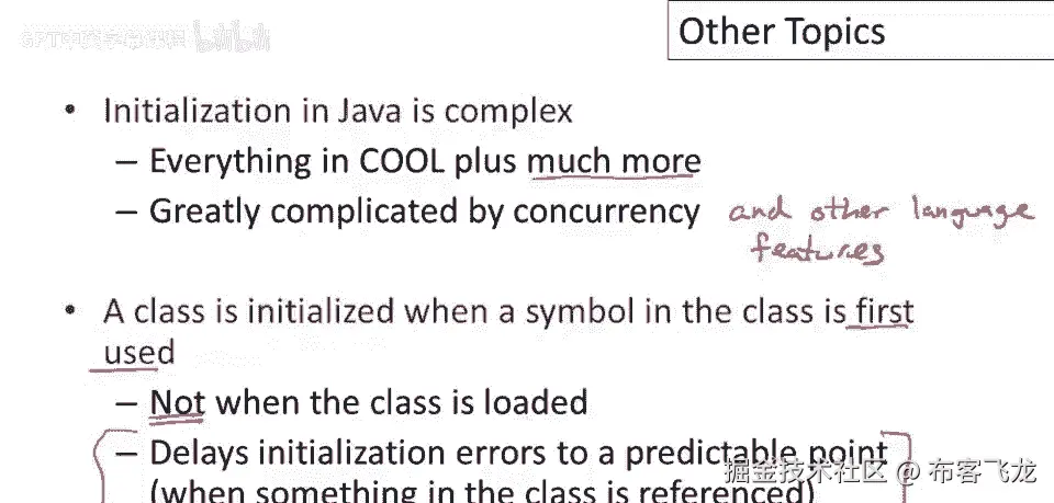 更多,现在主要复杂性来源是并发,但其他语言特性也增加了Java初始化的复杂性,事实上,嗯,如果你想理解一门新的面向对象语言,可以,研究它是如何进行对象初始化和类初始化的,因为在初始化中,本质上。