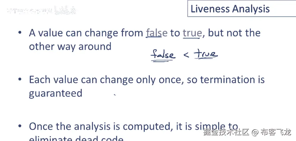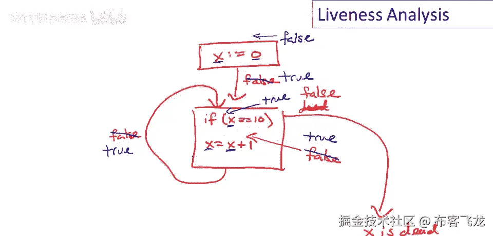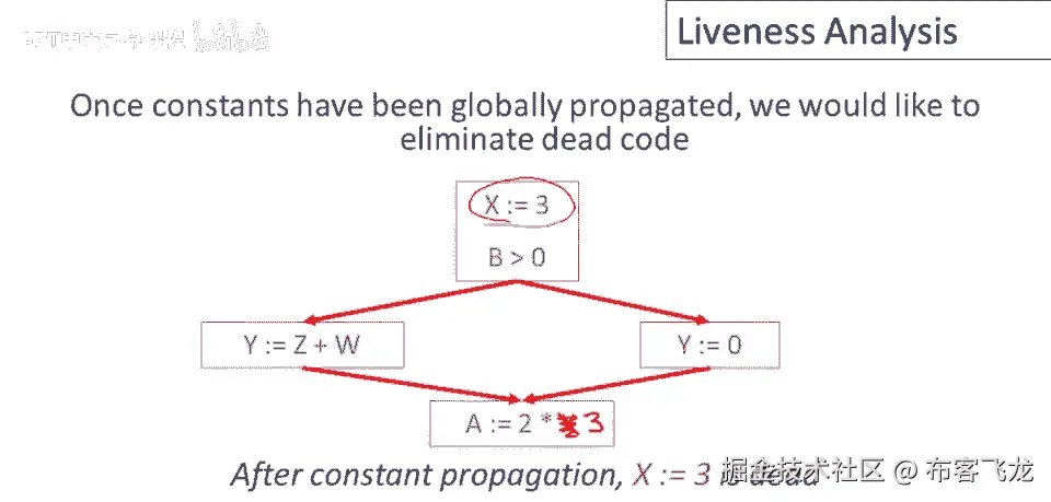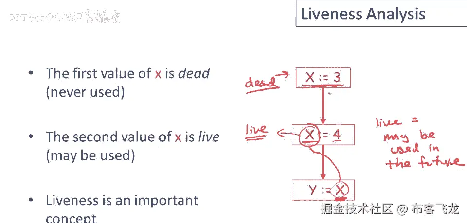 S现在活着,如果值不是活的,那么它是死的,对x的赋值语句将是死的,如果x在赋值后死亡,代码,所以如果我们知道在赋值会议后,立即对这个x的赋值后,未来没有可能使用x的值,那么,这个赋值是无用的。