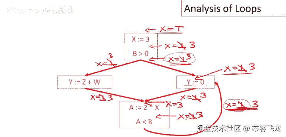 如果那条路径从未被采取,那么它不会贡献任何东西,所以在程序的这个点,我们将知道x等于三,假设所有这些信息都是正确的,我们将能够得出结论x等于三,在这个点并注意我们如何打破循环并开始。