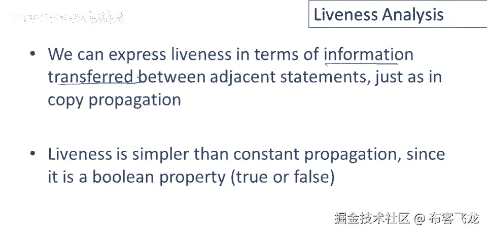 我们将定义并执行活跃性分析的算法,它将遵循相同的框架,我们将用相邻语句之间传递的信息来表达活跃性,就像我们为复制或常量传播所做的那样,结果将是,活跃性实际上比常量传播简单得多或稍微简单。