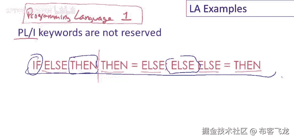 这里是所有变量,这些都是变量名,你可以想象,这使词法分析有点难,因为当我们只是从左到右扫描,就像我们在这里通过,当我们说我们到了这一点,你知道,如何判断这些是变量名或关键字,不考虑表达式其他部分。