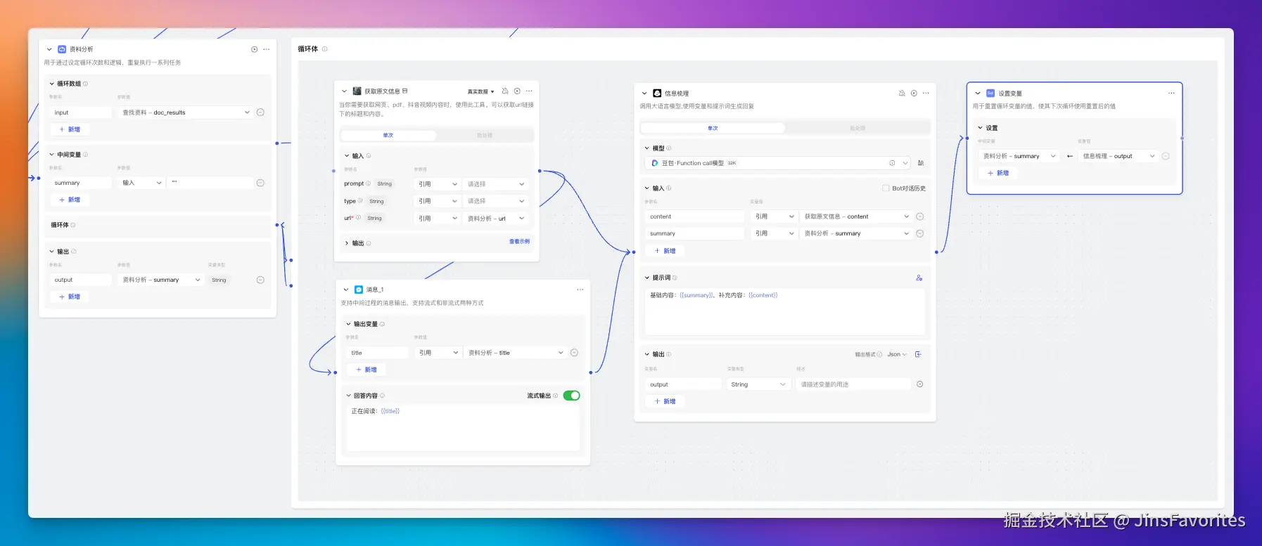 循环体 循环体是整个循环节点最重要的一部分,循环体里面可以引用工作流里的任意创建,相当于你可以在循环体里嵌套一个Workflow来完成输入变量的处理,在我们这个教程的bot里,循环体设计如下: 通过输入的URL使用插件获取网页的原始内容->输入给LLM对内容进行理解与总结->传递给中间变量,指导循环数组遍历完成,具体如下: