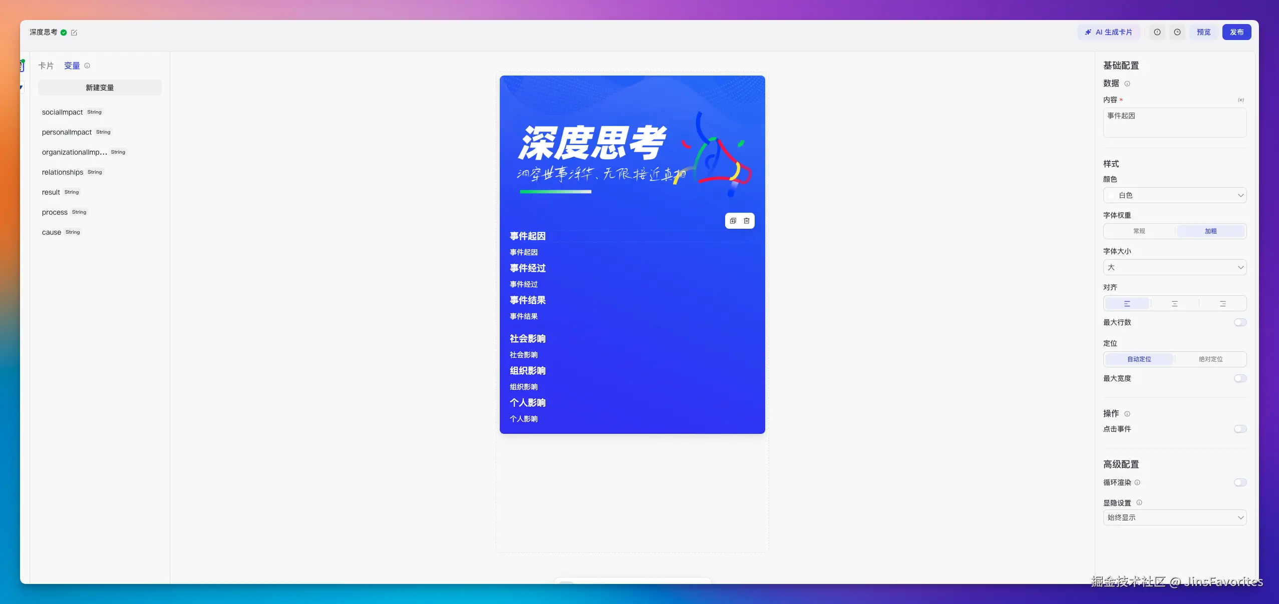 为了让输出的内容更加清晰易懂,此处我在节点上绑定了卡片,效果如下: